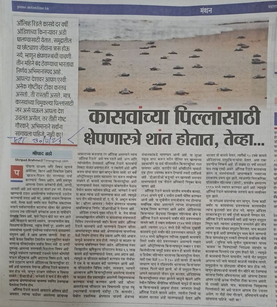 समुद्रातील छोट्याशा जिवांना त्रास होऊ नये म्हणून क्षेपणास्त्रे चाचणी तीन महिने बंद ठेवण्याचा भारताचा निर्णय –सारे काही कासवांच्या पिल्लांसाठी –याचे किती महत्व आहे ते लेख वाचूनच कळणार! सौजन्य महाराष्ट्र टाइम्स 30.12.2023