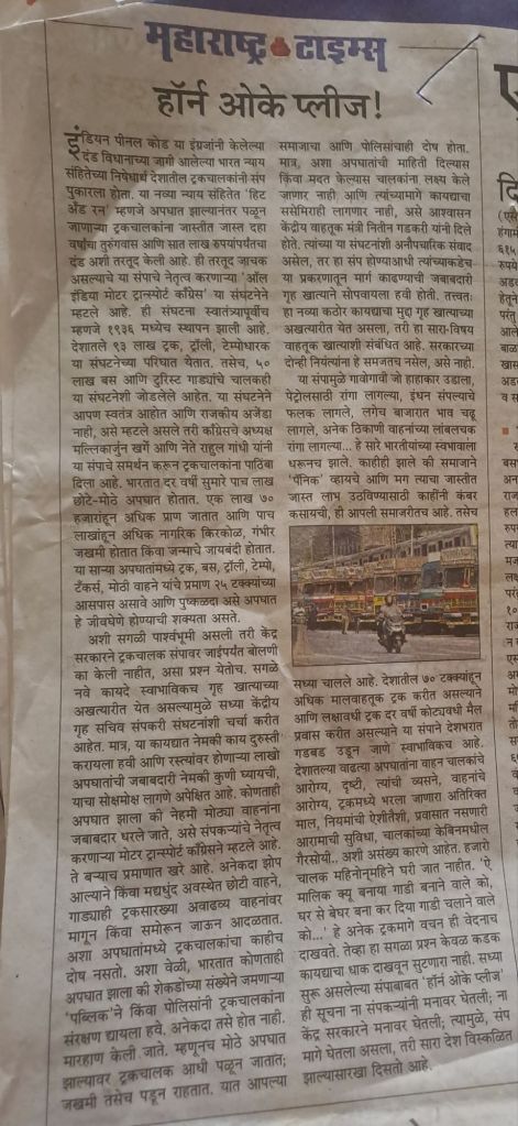 आज महाराष्ट्र टाइम्स मध्ये आलेला अग्रलेख–अतिशय उदबोधक माहिती–महत्त्वाचा पैलू–ट्रक चालक अपघात झाल्यावर पळून का जातात याचा केलेला उहापोह — 3.1.2024