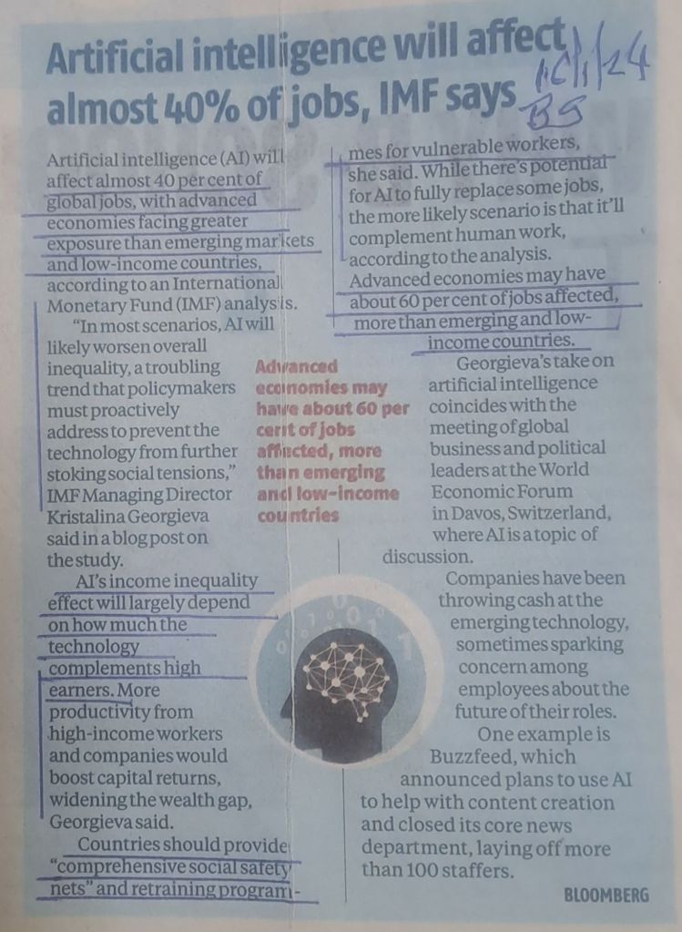 AI effect –IMF estimates advanced economies will face greater exposure than emerging markets and low income countries [2] further feels AI will likely worsen overall inequality [3] suggests countries should provide comprehensive social safety nets –Courtesy Business Standard 16.1.24