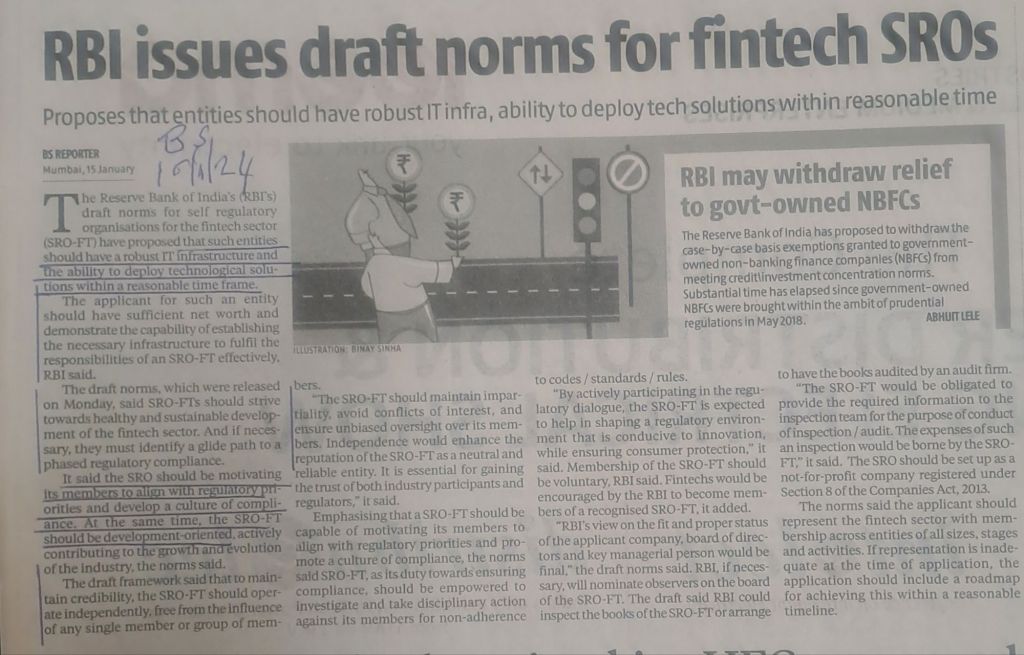 Fintech SROs –draft norms by RBI –Courtesy Business Standard 16.1.24