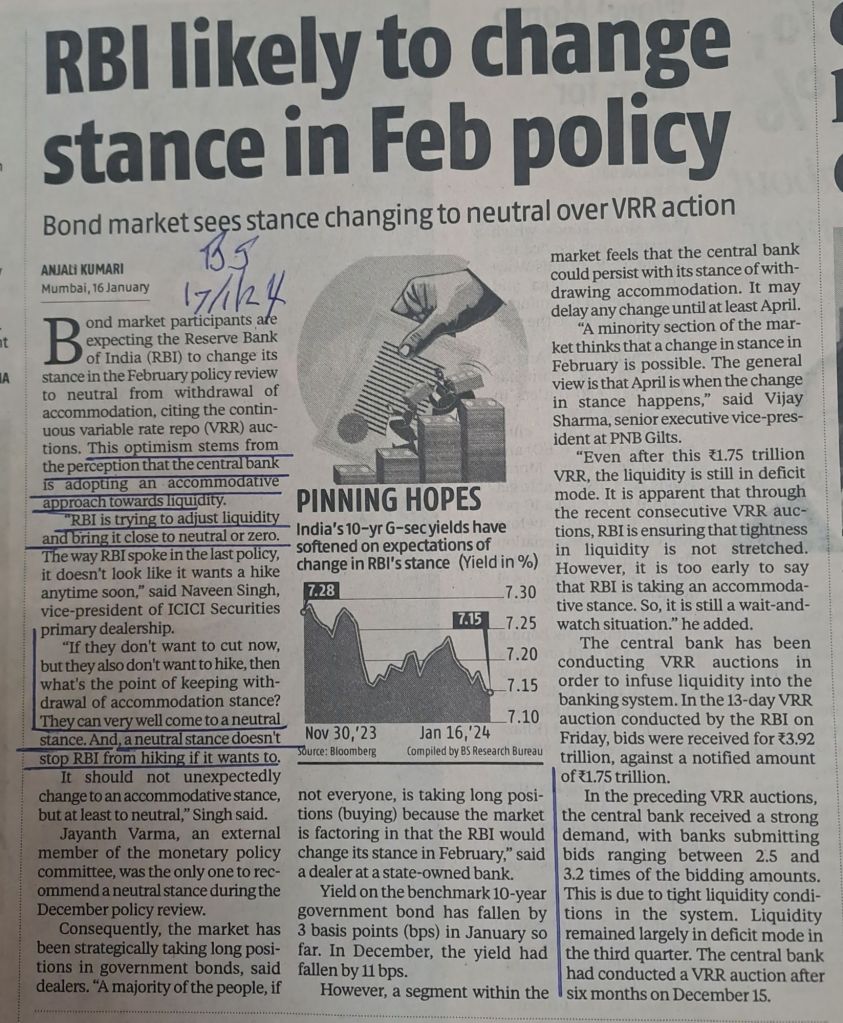 Liquidity is tight but RBI is coming to rescue with continuous VRR auctions [2] Is it a signal to change stance to neutral ? [3] Some markrt players r building up long positions in government bonds –Is it an indication of RBI changing stance ? Courtesy Business Standard