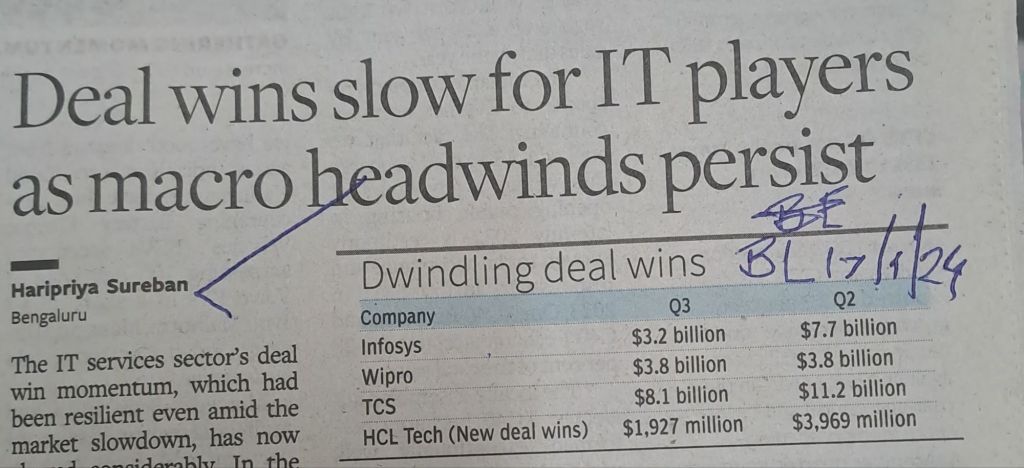 IT Industry prospects–Deal wins figures –Wipro retains but TCS and Infosys make a substantial retreat–Courtesy BusinessLine