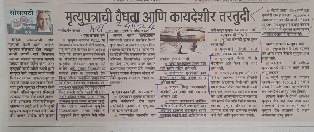 यातील कित्येक तरतुदी मला आजच समजल्या जसे — मृत्युपत्र रजिस्टर करावयास हवे असे नाही पण ते मृत्युपत्र करणाऱ्याच्या मृत्यूनंतर देखील रजिस्टर करता येते–सौजन्य महाराष्ट्र टाइम्स