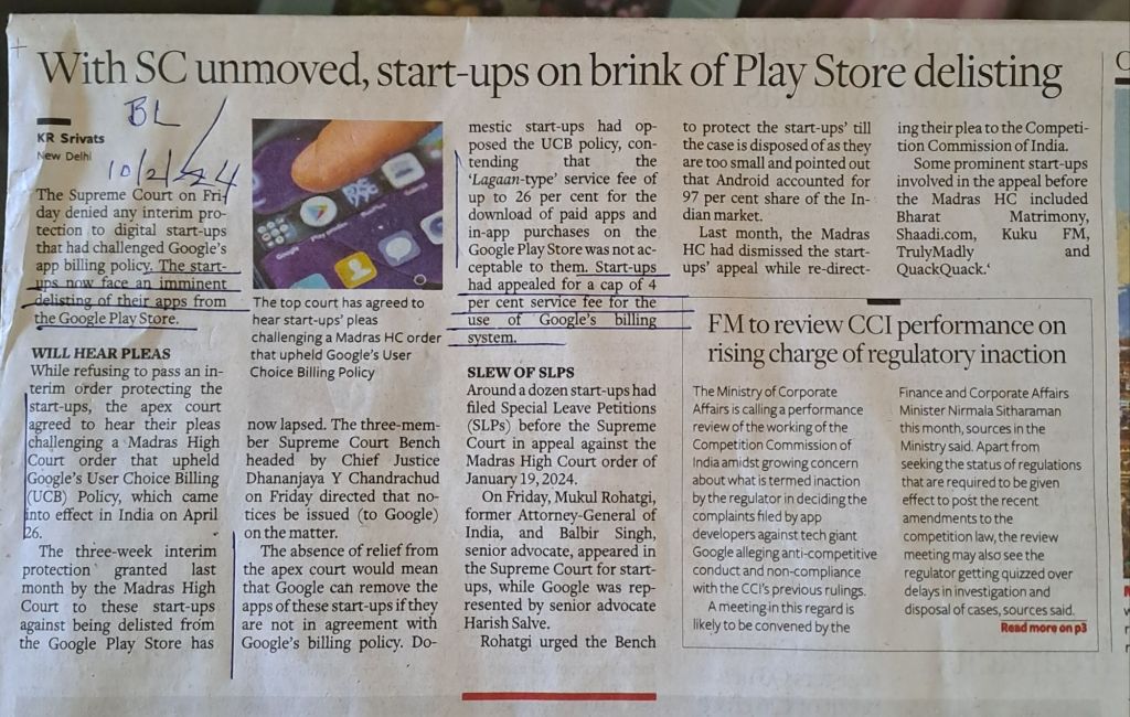 Tussle –Google v start up– Google billing policy –26% v 4% –courtesy BusinessLine