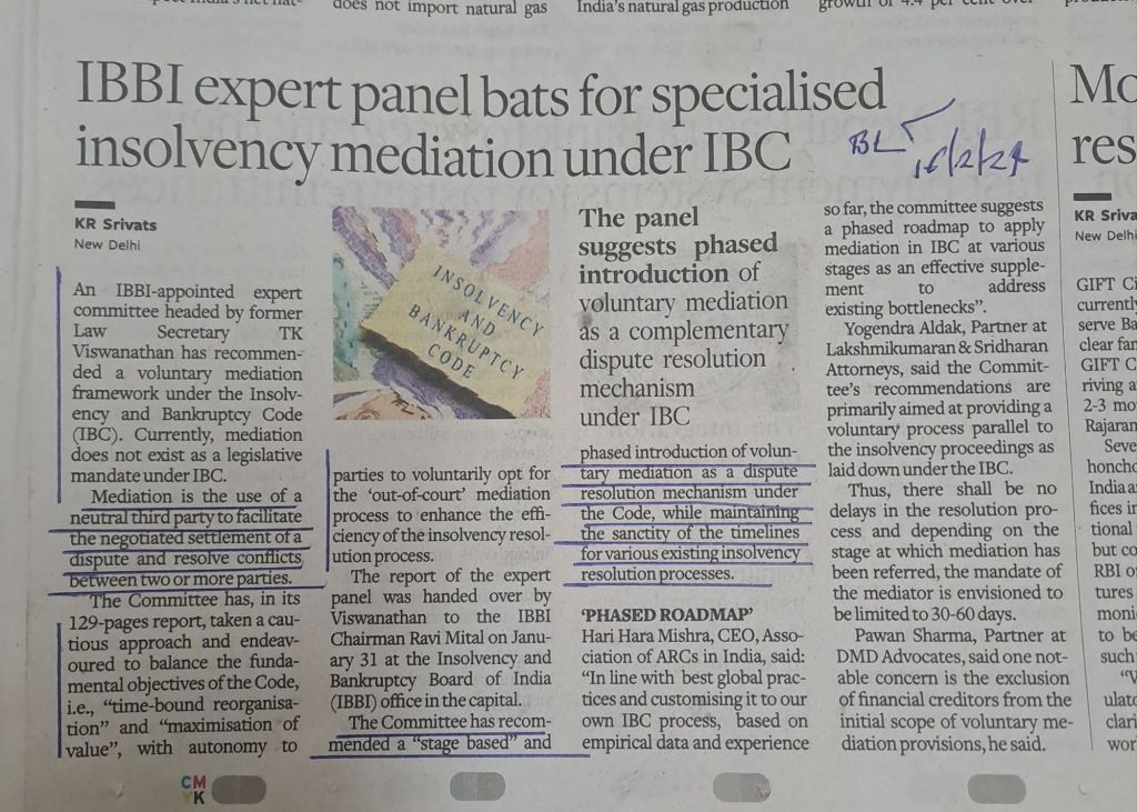 ЁЯСНProposed Mediation route in IBBI process — without compromising on fundamental objectives of the Act and without diluting the sanctity of timelines for various processes –Courtesy BusinessLine