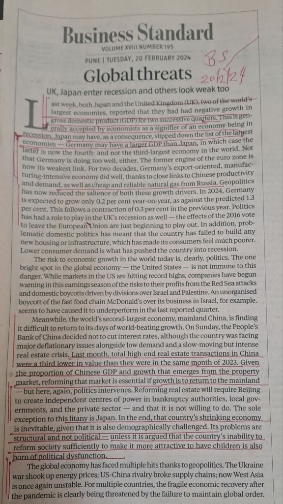 ЁЯСМJapan and Germany are in recession– China is bogged by Real Estate sector problems and the bright spot US is also suffering– Courtesy BS