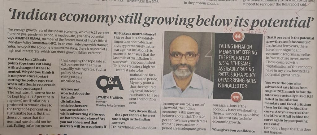 He strongly feels that the real interest of 2% is very high and that it is impeding growth. He further feels that even the continuance of present Repo rate means– indirect increase in repo rate because the inflation has come down but the reduction has not been appropriately reflected in repo rate.