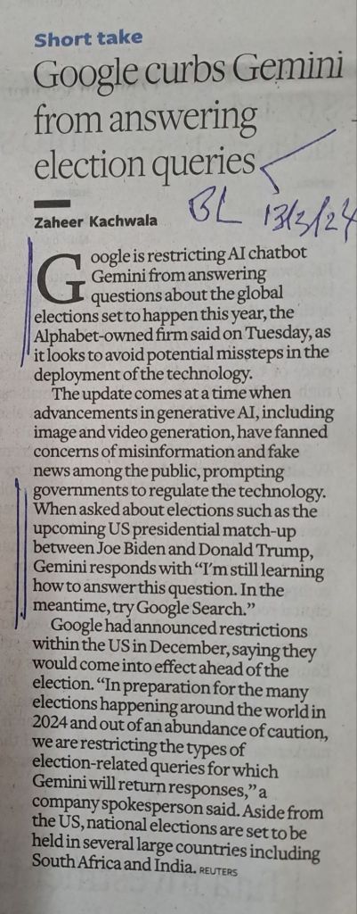 Google curbs Gemini from answering election queries– Courtesy BusinessLine