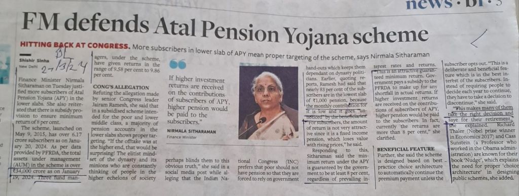 Atal Pension Scheme –worth knowing the features and the outcome so far –Courtesy BusinessLine 27.3.24