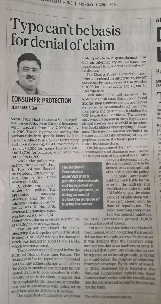 Stock insurance done for Rs.4 lacs–stocks damaged and claim was filed in 2009–the insurer challenged the claim on the ground that address of shop was not correct–National Commission in 2024 awarded the claim on the ground typo mistake should not be a ground for rejection [ worth reading– last para ] Courtesy BS 1.4.24