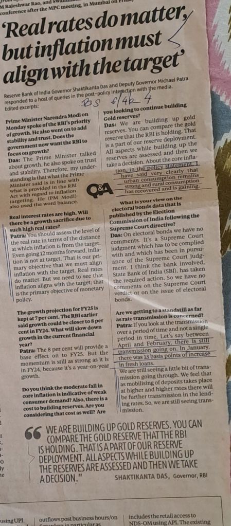 MPC decisions [1] About perceived weak consumer demand–RBI Governor responds by saying – urban consumption remains strong and rural consumption has recovered and is gaining –[ so by implication there is no weak consumer demand ] [2] Transmission– between April and February, there is still transmission going on –In January there was 13 basis points of increase in fresh loans. He feels as mobilisation of deposits takes place at higher and higher rates , there will be further transmission in the lending rates. [3] RBI says even going 12 months forward, inflation is not at target While real rates do matter but we need to see that inflation aligns with target that is the primary objective of monetary policy–Courtesy Business Standard