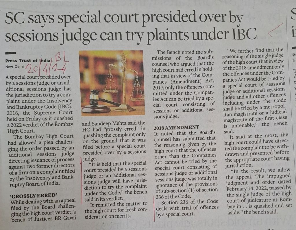 IBC 2016–Section 236–Special Court –SC says enough if Special Court is presided over by Sessions Judge or additional sessions judge — Courtesy BusinessLine