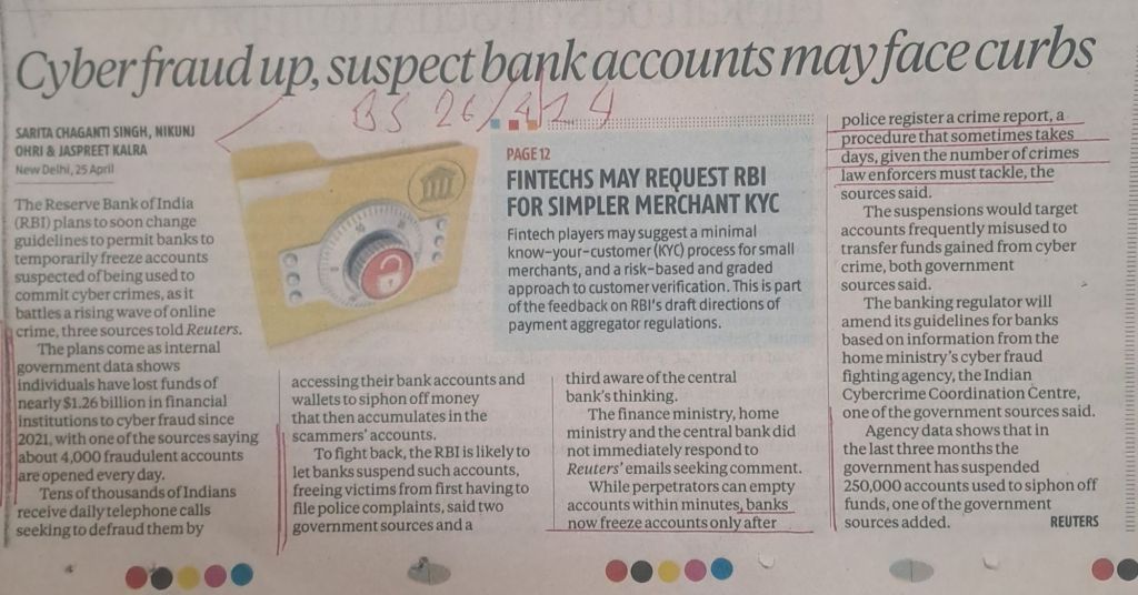 ЁЯЩПЁЯЩПЁЯЩПCyber fraud menace — [1] about 4000 fraudulent accounts being opened daily [2] $ 1.26 billion in financial institutions reportedly lost during 21 to 24 period [3] RBI likely to let banks suspend suspected accounts before police complaints are filed
