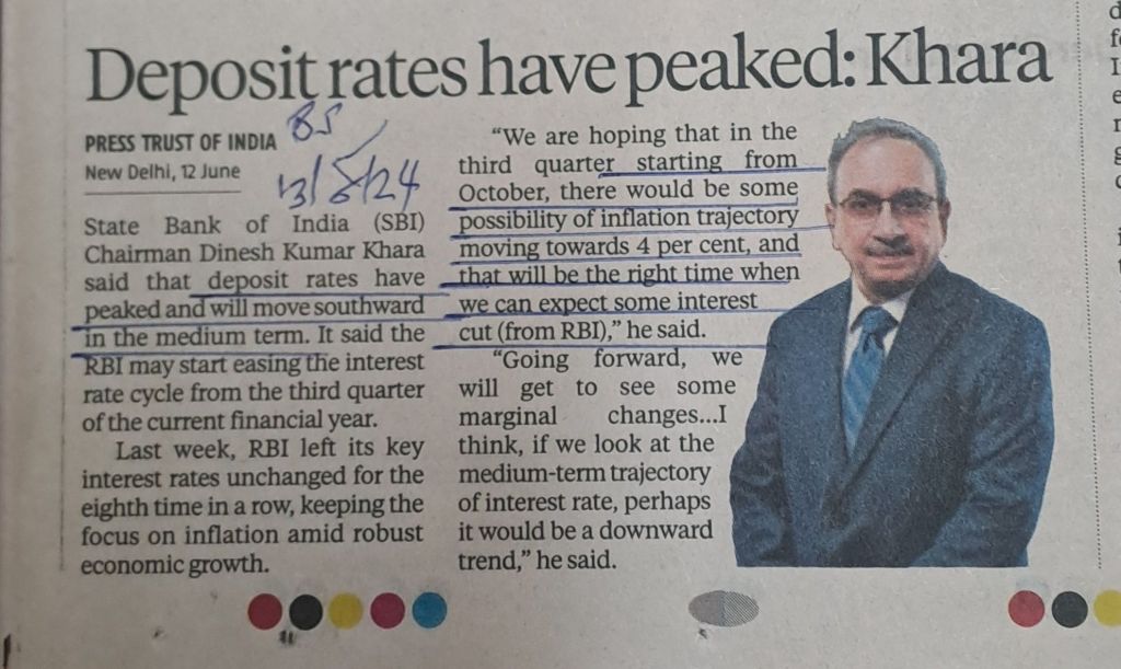 SBI Chairman feels there is virtually no scope for further rise in deposit interest rates — Courtesy Business Standard