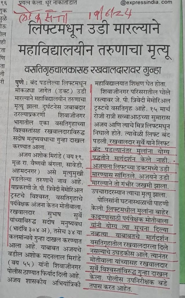 लिफ्ट सेफ्टी– सुरक्षा गार्ड तसेच सोसायटी पदाधिकारी या सर्वांनाच आव्हानात्मक परिस्थितीस सामोरे जावे लागतेय– गार्डस ना सेफ्टी ट्रेनिंग आवश्यक–सौजन्य लोकसत्ता