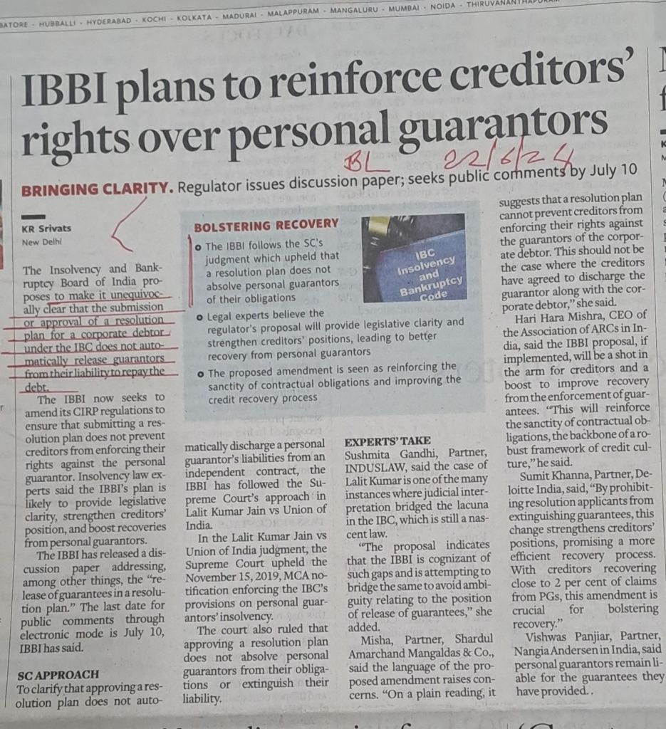SC in 2019 has already ruled — submission or approval of resolution plan does not prevent creditors from enforcing their rights against personal guarantors [2] what is sought to be done now is giving legislative clarity to what SC ruled in 2019 — Courtesy BusinessLine