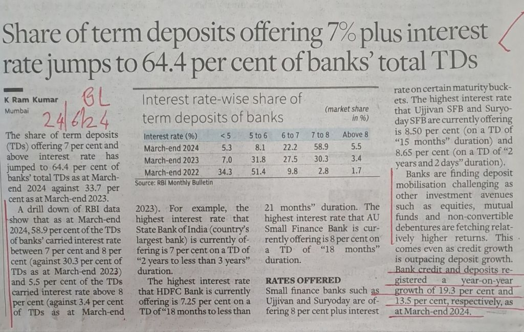 Interest on term deposits — 7 to 8 % bracket –share increases to 59% as on March 24 [ 30% March 23 ] and there seems no trend reversal in offing what with deposit growth lagging credit growth by a big margin —