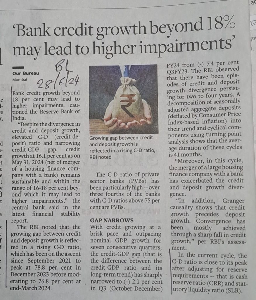 RBI concludes credit growth beyond 18% may lead to adverse effects — Courtesy BusinessLine