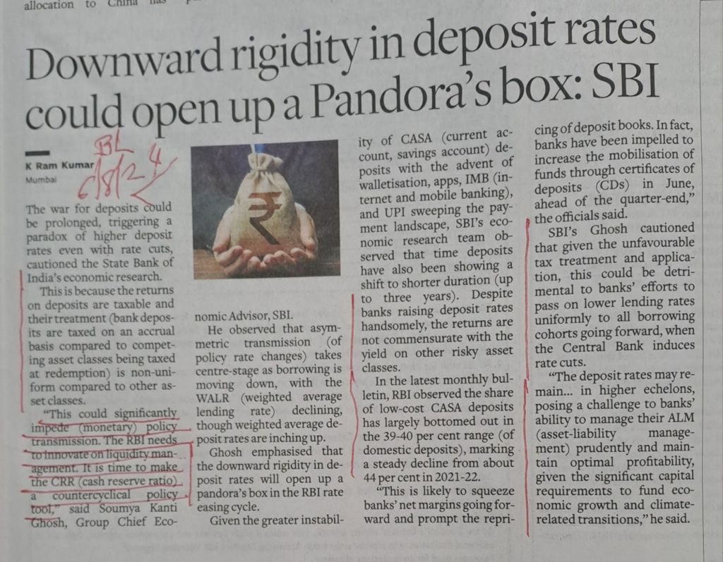 SBI Economic Research view –Banks will most likely find it difficult to ensure downward reduction in deposit rates though repo rate is reduced in future [2] says CASA deposits have largely bottomed out in the range of 39/40% of domestic deposits–Courtesy BusinessLine