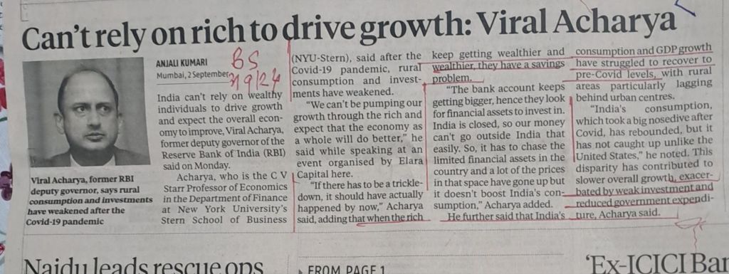 Ex RBI DG Mr. Acharya says it is rural consumption and investments –which suffered during covid –that need to increase to propel growth– Courtesy Business Standard
