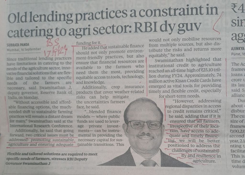 RBI DG feels finance practices to agricultural sector needs a completely revamped approach– Courtesy BS