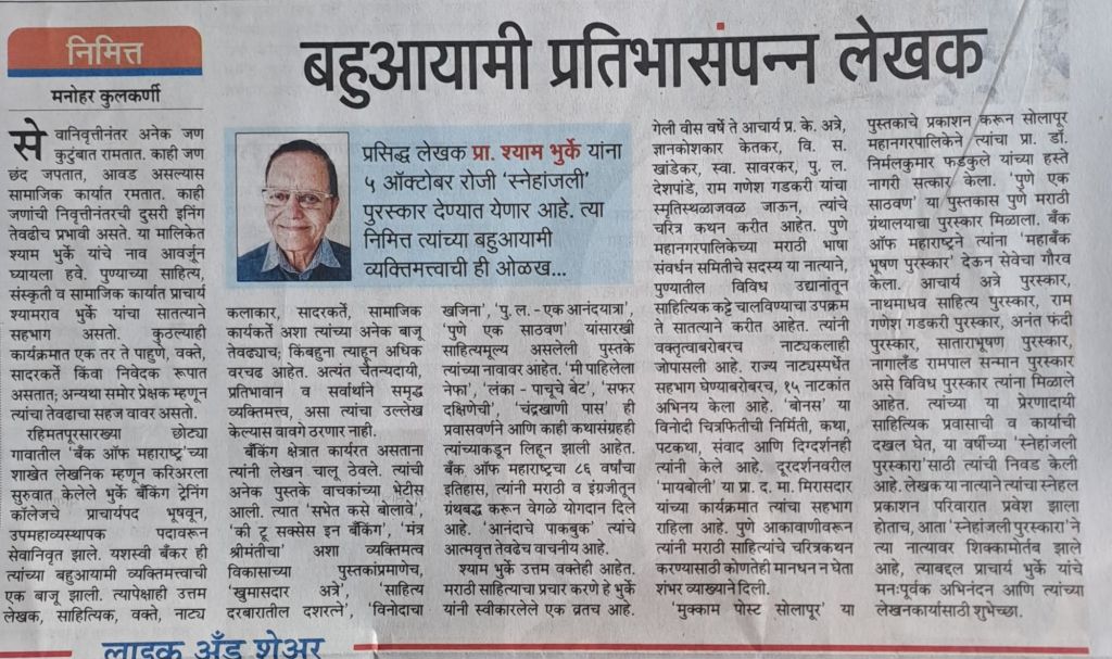 श्री श्याम भुरके– एक प्रतिभासंपन्न लेखक तसेच यशस्वी बॅकर देखील– सौजन्य महाराष्ट्र टाइम्स 20.9.24