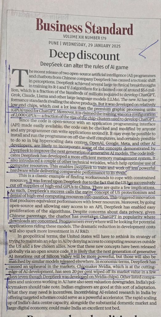 Business Standard editorial gives lot of clues as to what triggered the DeepSeek invention and what India can do — Courtesy Business Standard