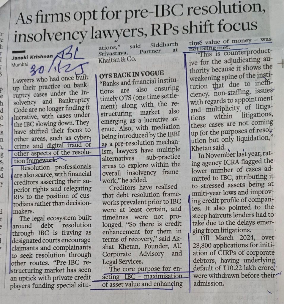 IBBI–for lack of scope, professionals like Advocate and Insolvency Professionals are shifting their focus to other areas- -[2] over 28000 applications — till March, 2024–for initiation of CIRPs by corporate debtors —with underlying default of 10.22 lac crores–were withdrawn before their admission –Courtesy BusinessLine