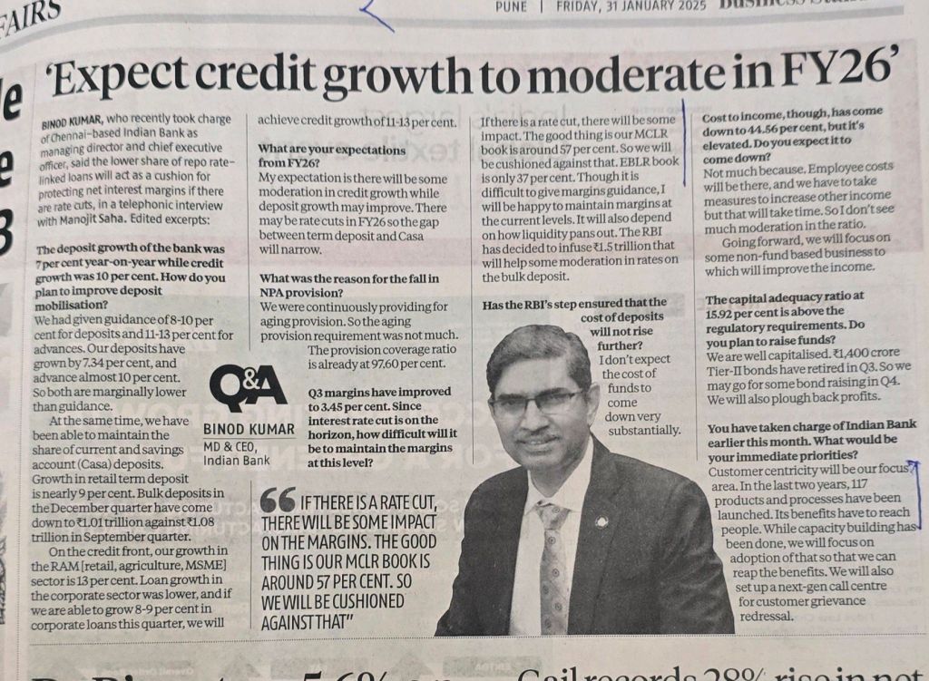 Indian Bank sitting pretty with MCLR 57% and EBLR only 37%– so any rate cut will have sufficient cushion and / or will have minimal effect — Courtesy BS