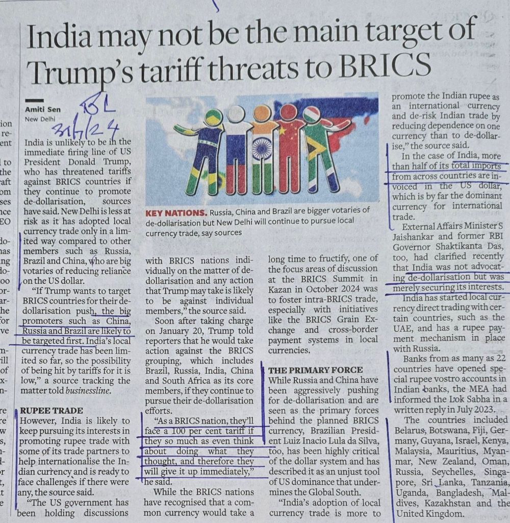De-Dollarization — Initially Russia- China and Brazil are likely to be targeted [2] they will face 100% tariff if they do what they have declared [3] additional information–India imports 50% of its import requirements — in dollar terms–[4] 22 countries that have opened special rupee vostro accounts in Indian banks — major countries being Germany- UK-Malaysia-Russia– Courtesy BusinessLine