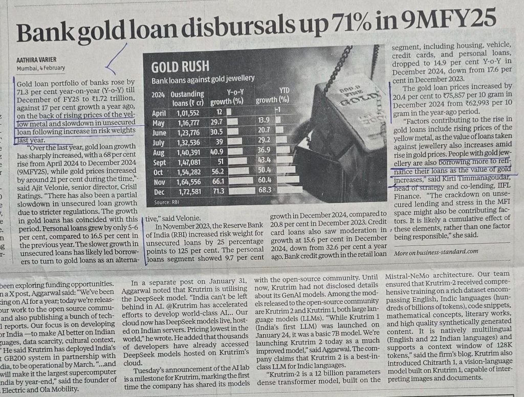 *Gold loan portfolio rose by 71% year in year till December 25 to 1.72 trillion [2] on the back of rising prices of gold -[ from 62993 per 10 gram in December 23 to 75857 in December 24 — [3] and slowdown in unsecured loans following increase in risk weights by 25% to 125% on November 23 – Courtesy Business Standard