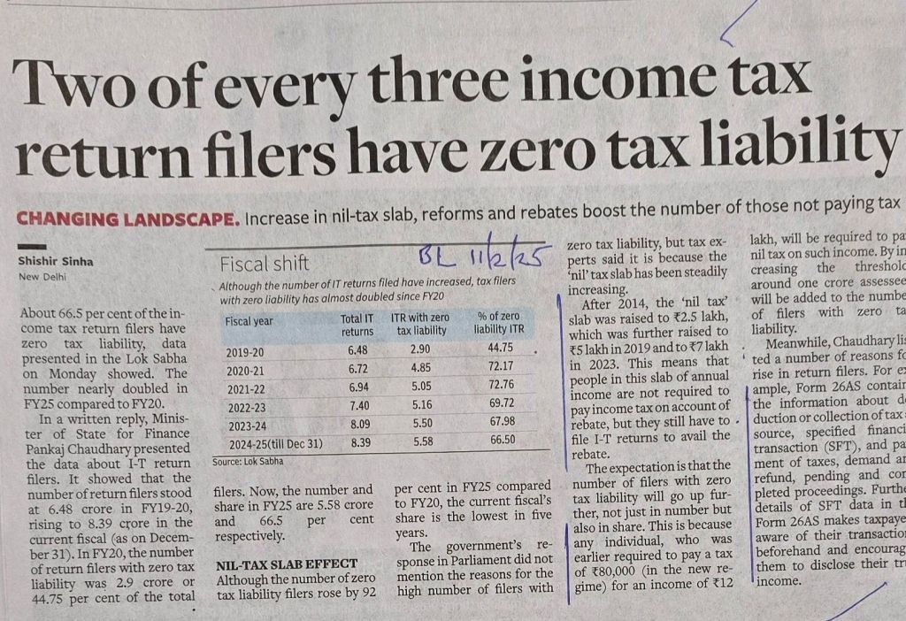Proportion of fliers with nil tax liability now 66.50% [ till Dec 31 from FY 25 ] up from 45% in FY 20– Courtesy BusinessLine