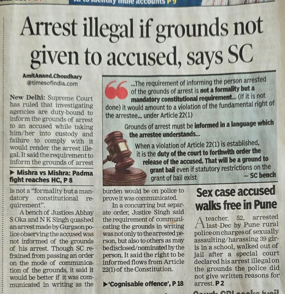 SC strikes down arrest as illegal if grounds are not given to accused — Courtesy Business Standard