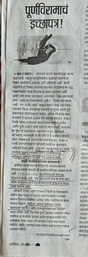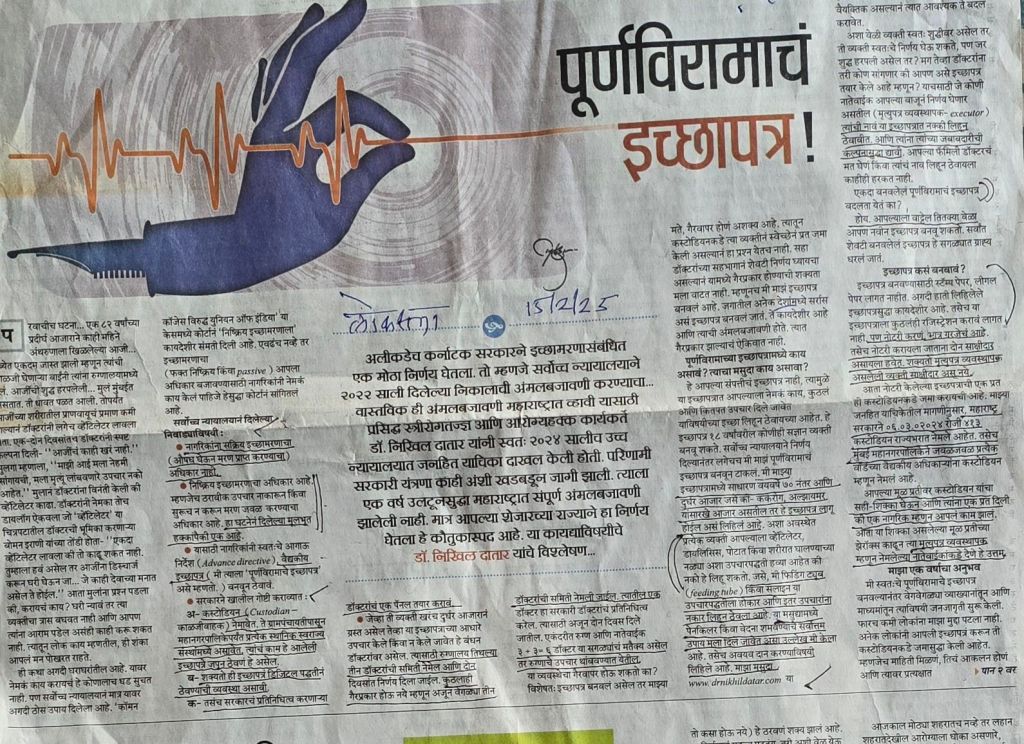सक्रिय इच्छा मरण– हा लेख डॉक्टर निखिल दातार यांनी लिहिला आहे– प्रत्येकाला विचार करावयास लावणारा हा लेख आहे–हा लेख लोकसत्ता चतुरंग मध्ये 15.2.25 रोजी आला आहे