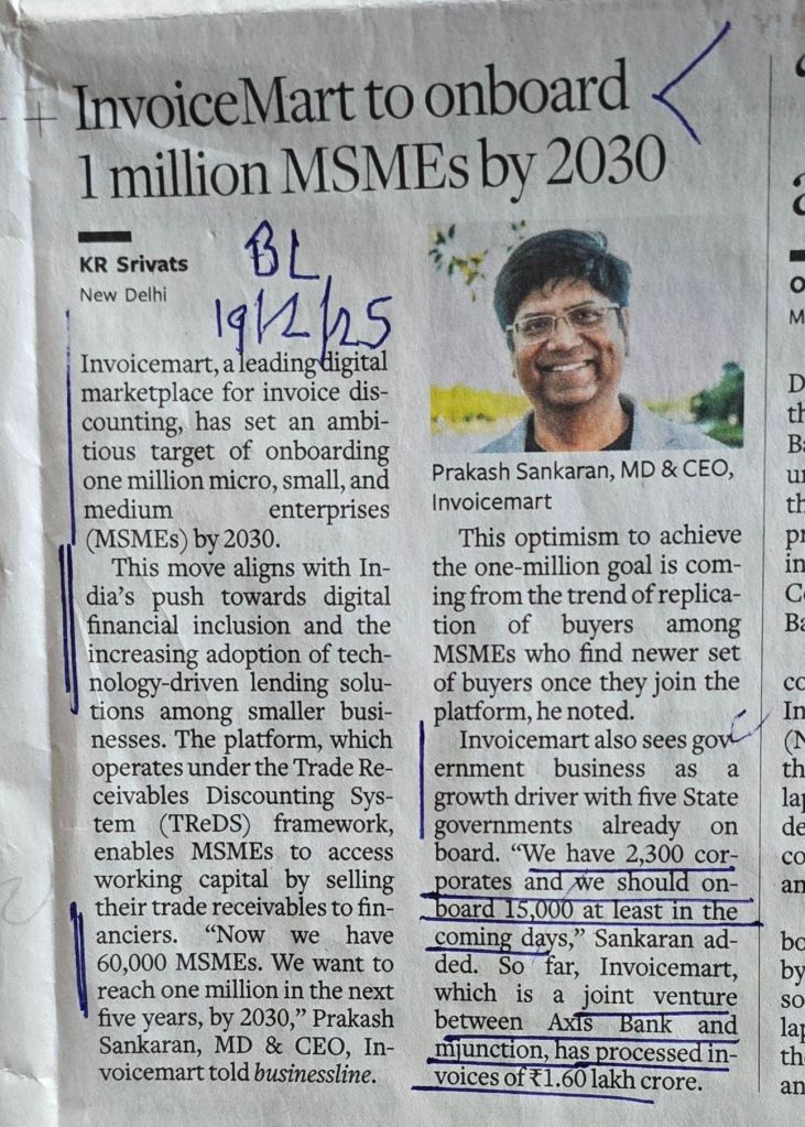 Invoice Mart — into invoice discouting has plans for MSMEs — will on-board 1 million by 2030 — Courtesy BusinessLine