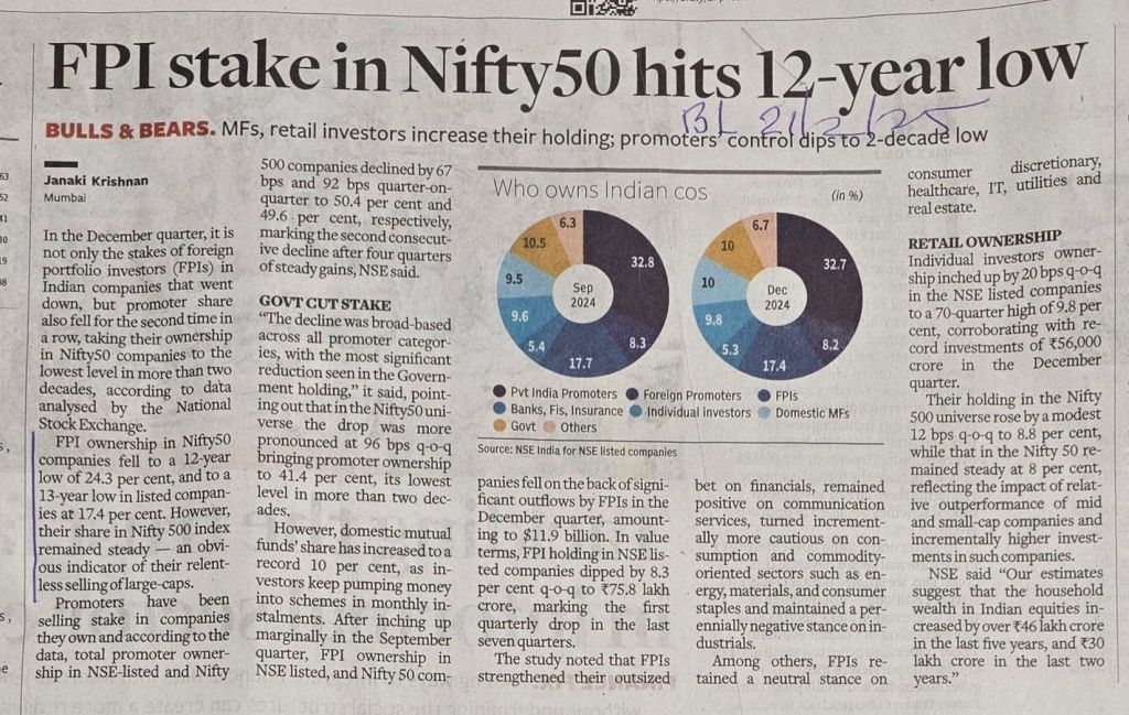 FPI stakes in NIFTY 500 INDEX remain almost same [ though it is reduced to 12 year low of 24.3% in NIFTY 50 ] Courtesy BusinessLine