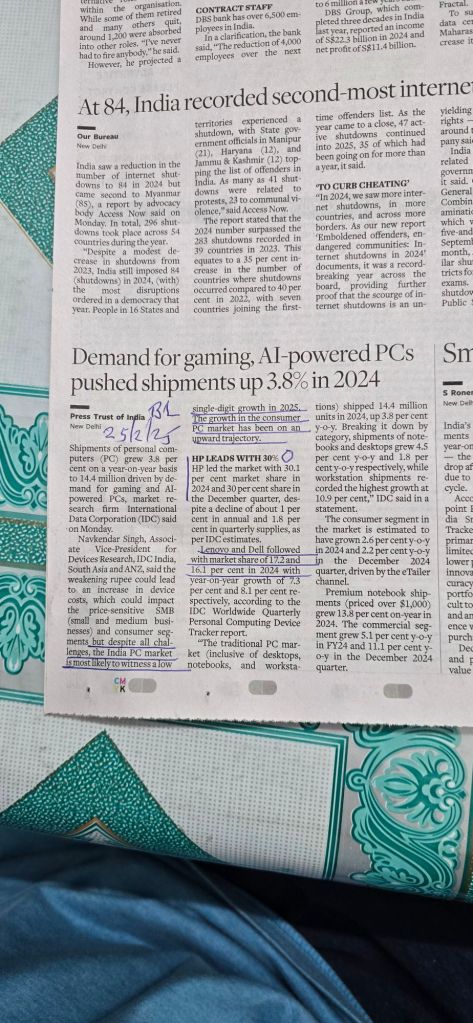 Demand for gaming, AI powered PCs pushes shipments up 3.8% in 2024 [2] HP continues to lead with 30% share followed by Lenovo 17.2% and Dell 16.1% — Courtesy BusinessLine