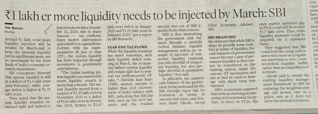 1 lakh crore more liquidity needs to be injected by March end to keep the systemic liquidity just in equilibrium–SBI Economic Research Department– Courtesy BusinessLine