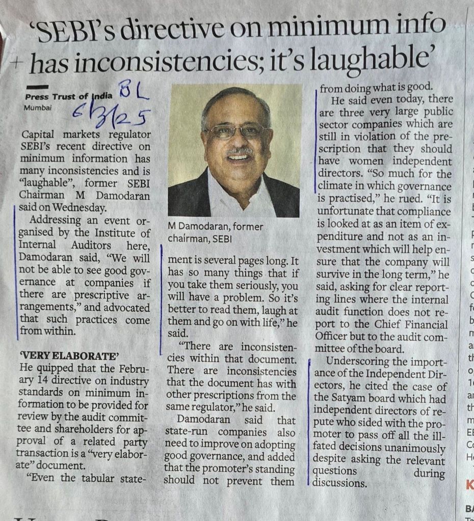 Ex SEBI chief strongly feels good governance — in companies–will not happen if there are prescriptive arrangements [2] says such practices come from within [3] gives example of Satyam ( last para ) –Courtesy BusinessLine