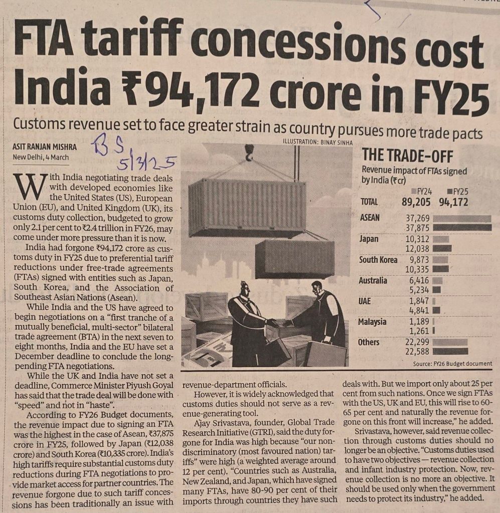 We are inclined to take FTA as a panecca, but it has a cost — 94172 crore custom duties forgone in FY 25– [2] but is there any alternative what with USA beginning to slam doors on world trade ? [3] However some feel custom duties should not be an objective– Courtesy Business Standard