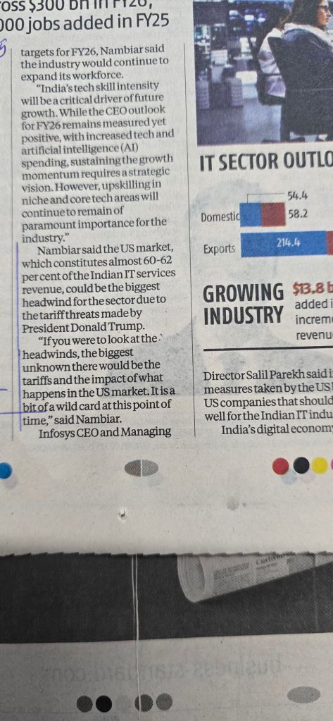 US market constitutes 60/62% of Indian asoftware companies and [2] biggest unknown is tariff related issues –Mr Nambiyar — NASSCOM — Courtesy Business Standard