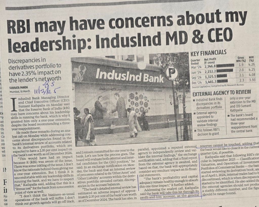 IndusInd Bank CEO — on his one year extension instead of 3 years– Courtesy Business Standard