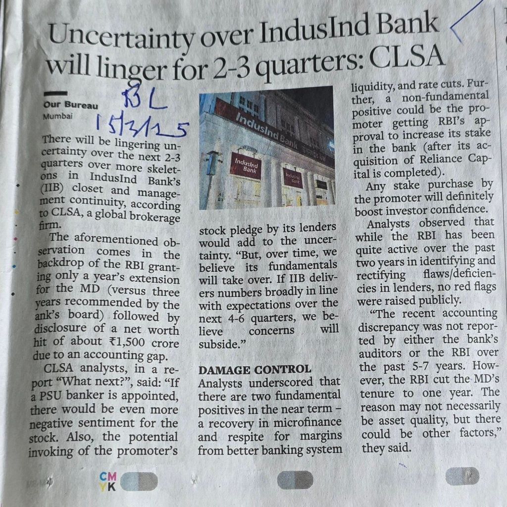 CLSA on IndusInd — [1] If a PSU banker is appointed, there will be even more negative sentiment for the stock [2] also the potential invoking of the promoter’s stock pledge by its lenders would add to the uncertainty– Courtesy BusinessLine