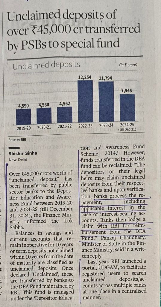 Huge amount by any reckoning — (2) Government–through RBI – is doing its best to return [3] access to UDGAM portal is what the likely claimants need to do and initiate refunds — [4] matter of study as to what needs to be done more — Newsitem Courtesy BusinessLine
