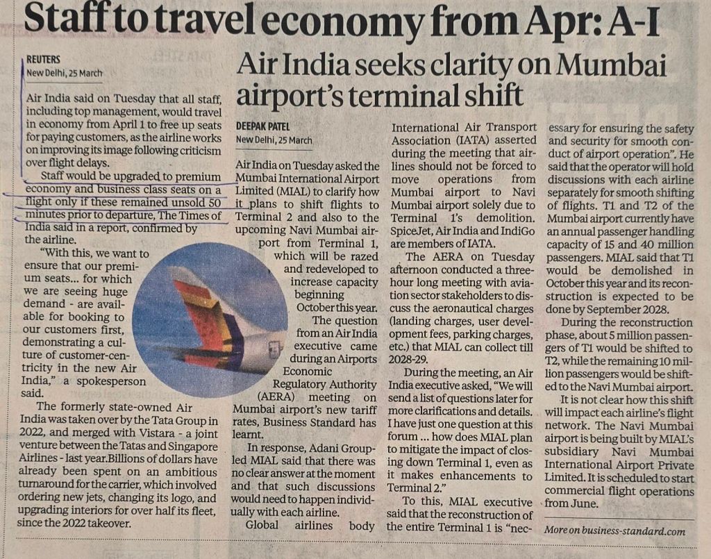 Air India directs its staff to travel economy (2) which will boost profitability –Courtesy Business Standard