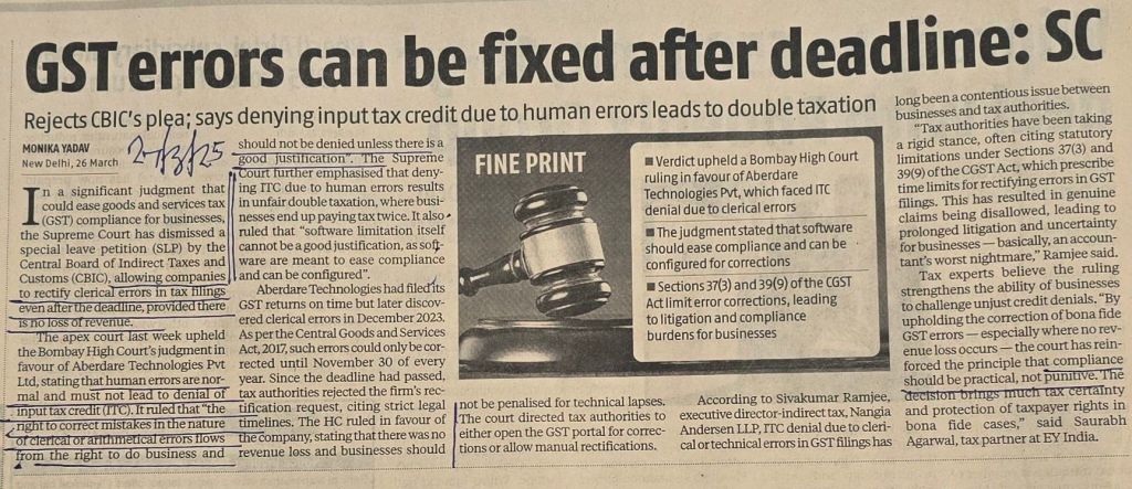 Supreme Court comes to rescue — states [1] human errors are normal and must not lead to denial of input tax credit [2] right to correct mistakes in the nature of clerical or arithmatical errors flows from the right to do business and should not be denied unless there is a good justification [3] software limitation itself cannot be a good justification as software are meant to ease compliance and can be configured– News Courtesy Business Standard