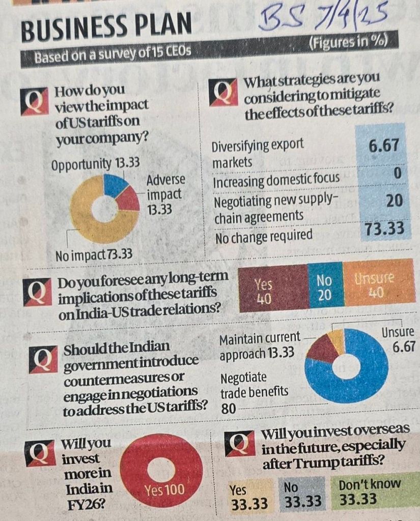 US Tariffs– Overall mood [ in the survey] seems to in favour of [a] 73% no adverse impact [b] No change in export strategy required– Courtesy Business Standard