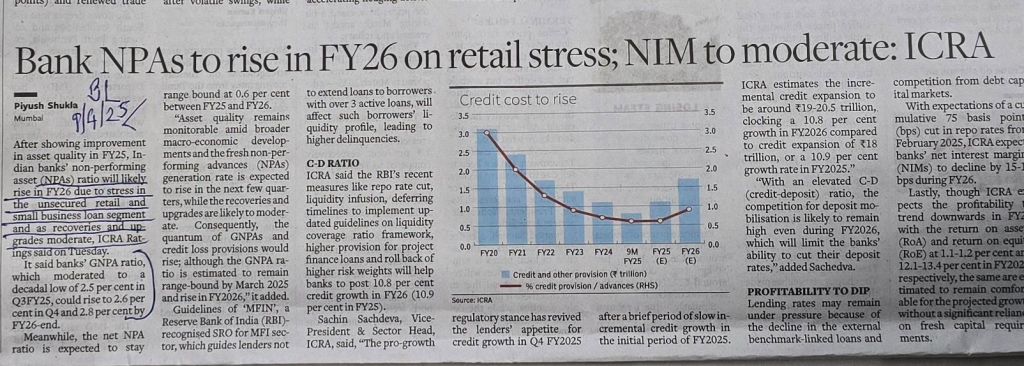 Gross NPA Ratio by FY 26 could rise to 2.8% vis a vis decadal low of 2.5% in Q3FY 25 — ICRA [2] reason — stress in unsecured retail and small business loan segment– Courtesy BusinessLine