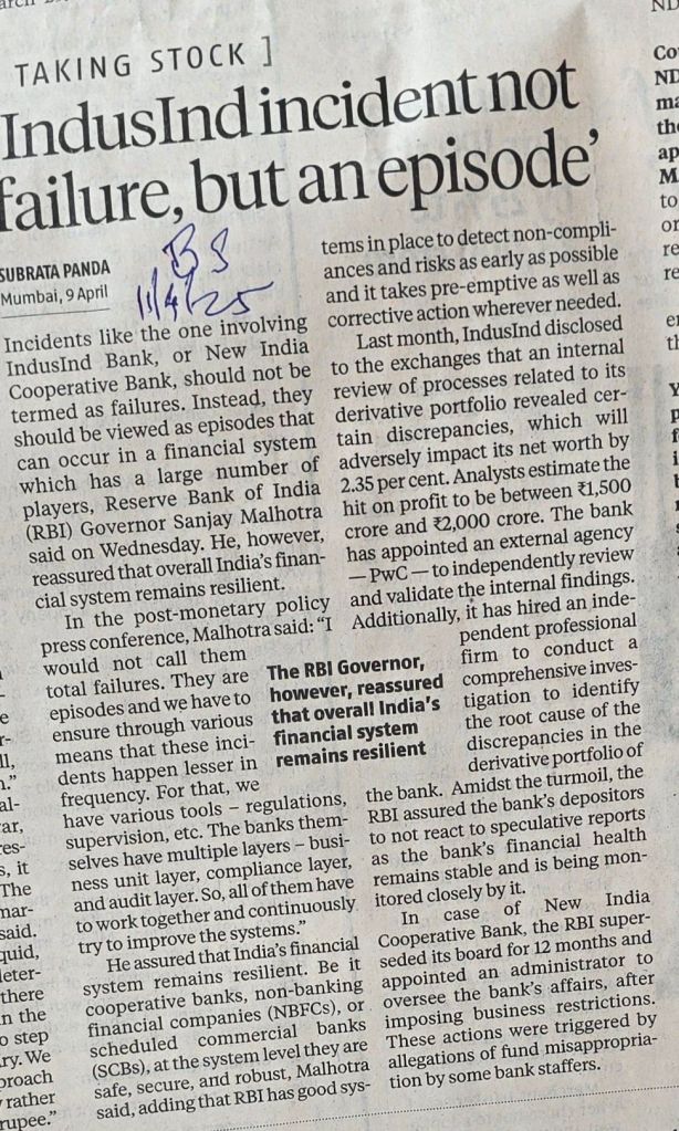 RBI impressions about IndusInd and New Bank of India issues — Courtesy Business Standard