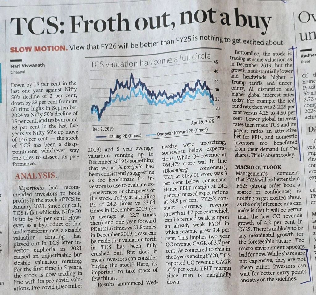 Stock is trading at the same valuation as in December 2019 [2] But the growth is substantially lower and headwinds higher –[a] Trump tariffs and uncertainty [b] AI disruption [c] higher global interest rates today [ 2/2.25 v 4.25/4.5 ] Courtesy BusinessLine